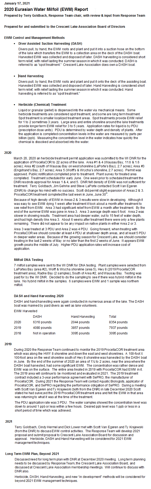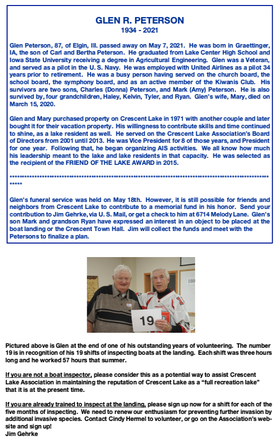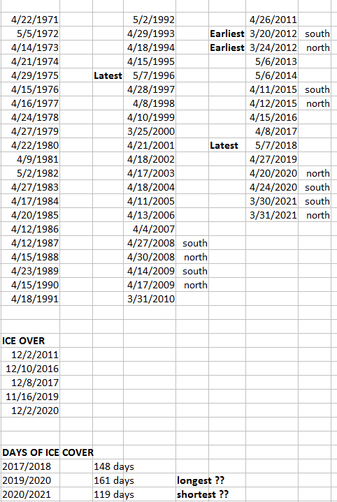 Crescent Lake Ice Out & Over Posted on April 15, 2021 by John Zinda Based upon information from Jim Voborsky, Eileen Ronyak, Darrel Mack, Alan Janssen