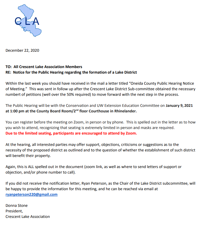 Letter to all CLA Property Owners Posted on January 5, 2021 by John Zinda Ewm Letter All Property Owners